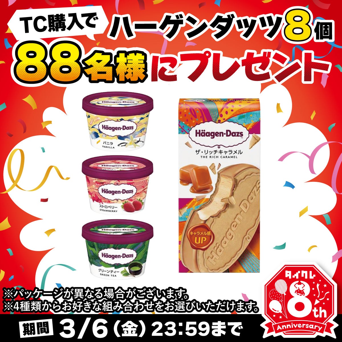 期間中、1,100円以上のTC(タイトーコイン)パックをご購入のお客様の中から抽選で88名様にハーゲンダッツ8個をプレゼントいたします。