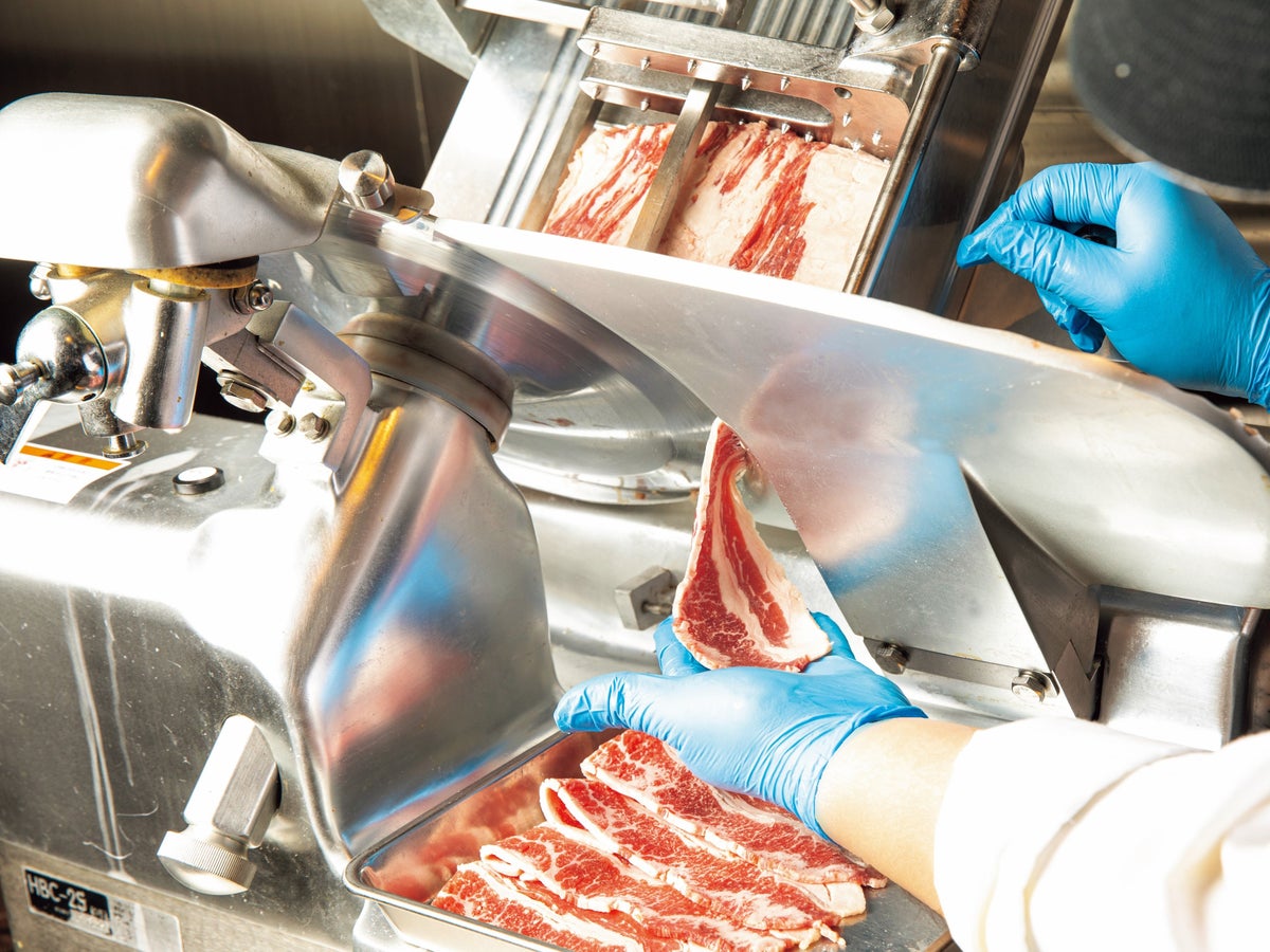 肉のヤマ牛は各店舗が精肉店のようにブロックで肉を仕入れ、肉の部位や状態を見極め、その肉が一番おいしくなるように、その日使う分だけをカットしています。