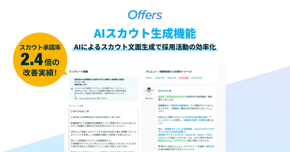 AIが候補者の経歴・スキルを分析し、最適なオファー文面を自動生成する「AIスカウト生成機能」をリリースしました。実際に導入いただいた企業では、スカウト承諾率が従来比2.4倍に向上した実績があります。詳細は下記よりご覧ください。