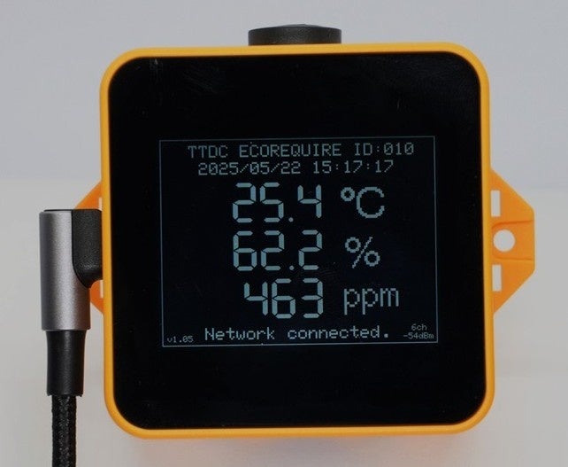 当社は、自動車産業で培ってきた計測・制御技術を活用し、環境むらを可視化する専用の小型計測器「環境センシングシステムECOREQUIRE」を開発しました。ECOREQUIREは温度、湿度、CO2、気圧を時刻同期しながら計測でき、複数箇所に設置する「多点計測」を得意としています。計測した環境データはWi-Fiでクラウドへアップロードし、専用アプリを使って遠隔監視でデータ閲覧やダウンロードが可能です。