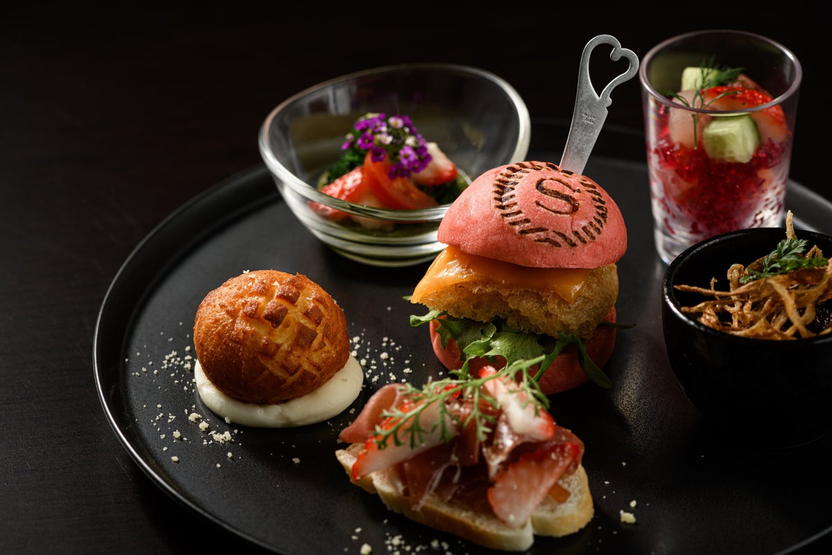 春野菜と苺のマリネ / 黒毛和牛の赤ワイン煮込み / 鹿児島県産白身魚のマリネ 苺とビーツのジュレ添え / ハモンセラーノと苺のブルスケッタ / 鹿児島県産白身魚のスライダー / シューフリット チーズクリーム添え