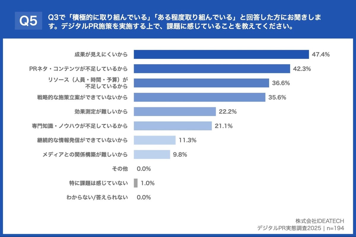 デジタルPR実態調査では、91.3%がLLMOを重要視する一方、実施上の課題は「成果が見えにくいから」(47.4%)、「PRネタ・コンテンツが不足しているから」(42.3%)が上位でした。
