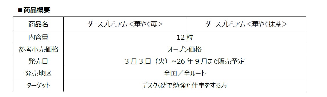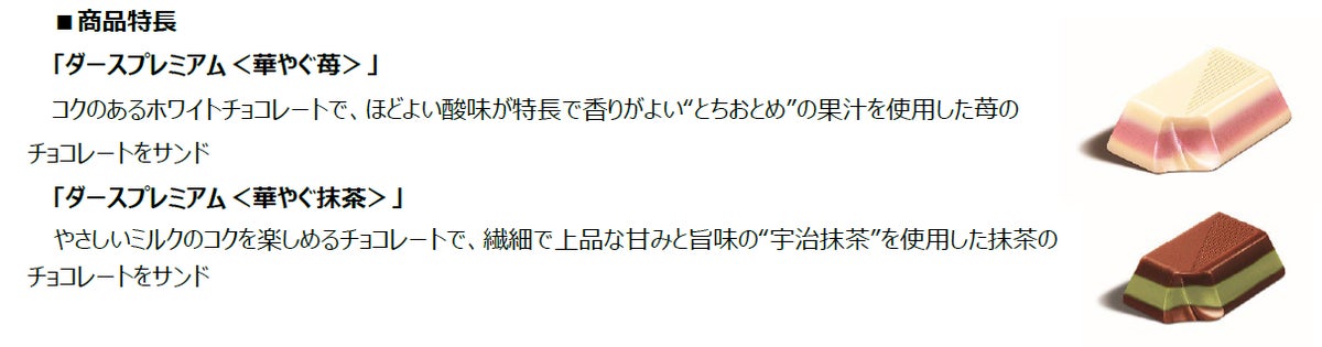 「ダースプレミアム<華やぐ苺>」は、コクのあるホワイトチョコレートで、ほどよい酸味が特長で香りがよい“とちおとめ”の果汁を使用した苺のチョコレートを挟んだ3層仕立てのプレミアムなダースです。「ダースプレミアム<華やぐ抹茶>」は、やさしいミルクのコクを楽しめるチョコレートで、繊細で上品な甘みと旨味の“宇治抹茶”を使用した抹茶のチョコレートを挟みました。
