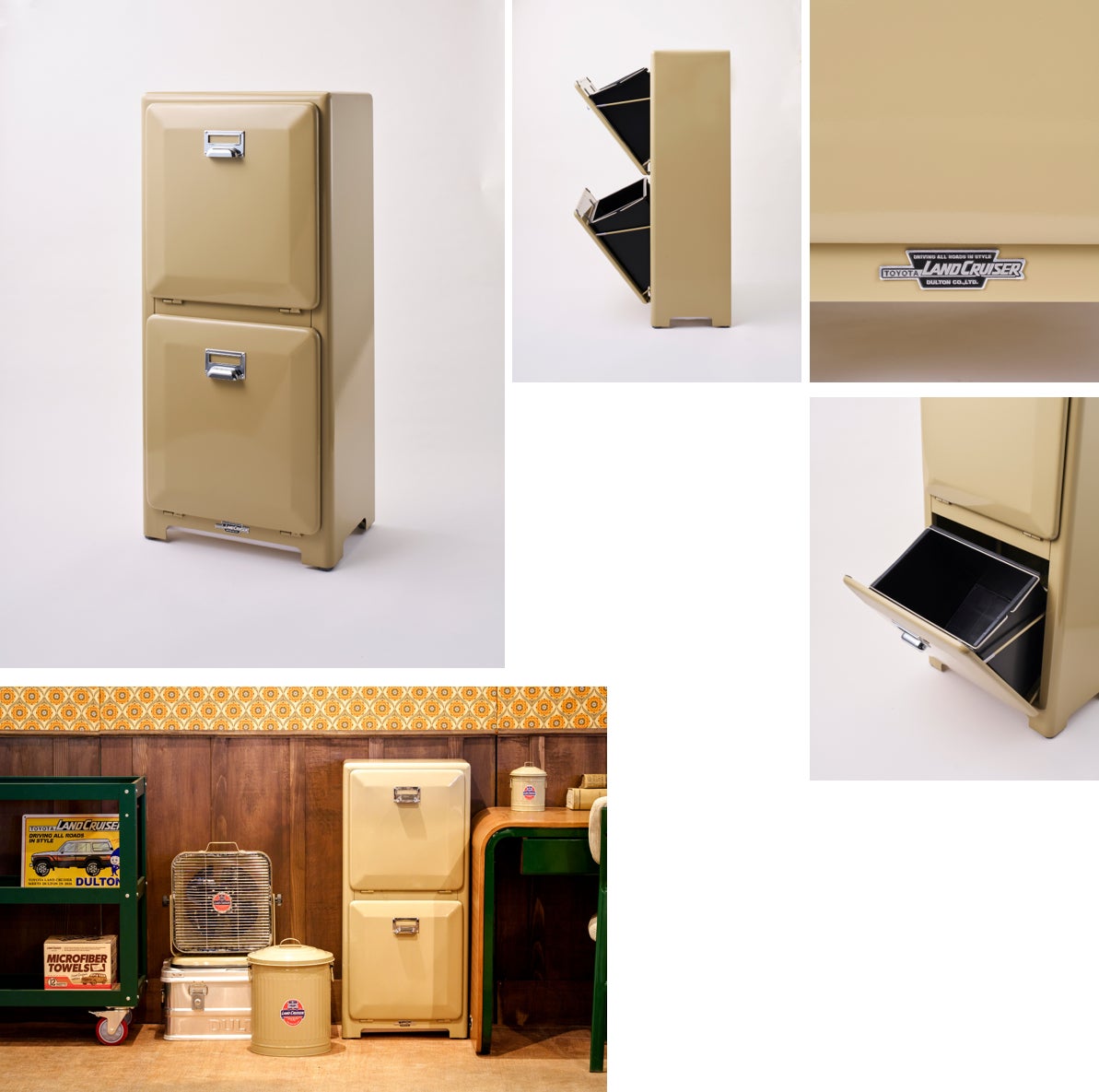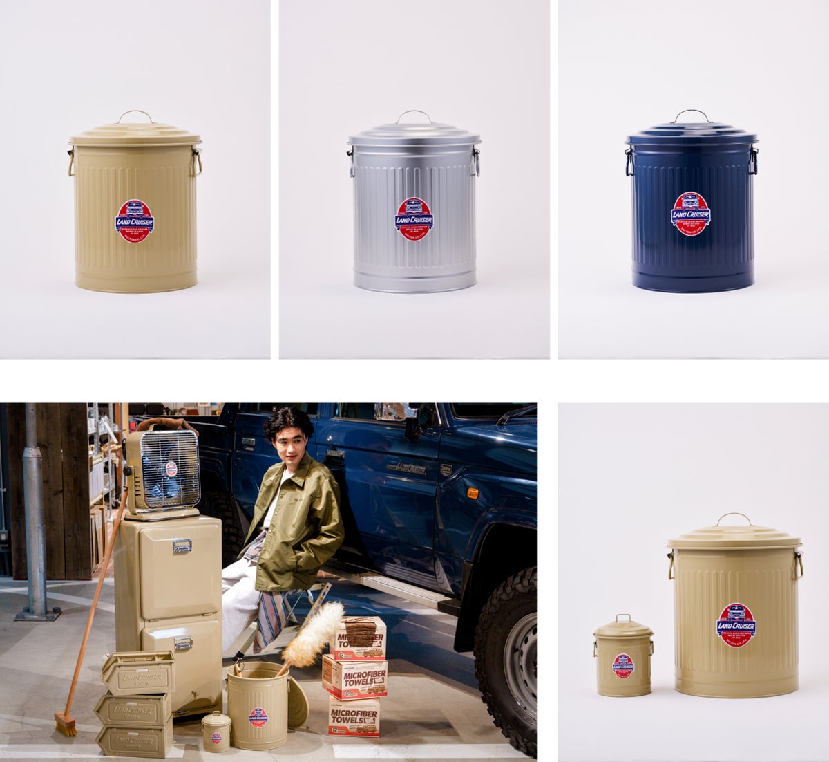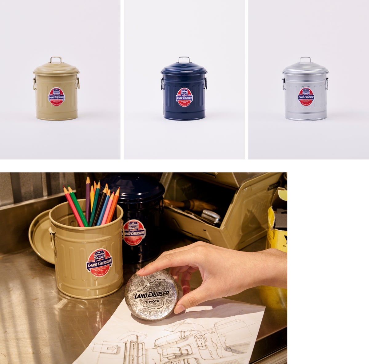 ラインアップは、GARBAGE CANやPARTS STOCKERなどダルトンの中でも特に人気の高い商品たちに、ダルトンが創業した1980年代に生まれたランドクルーザー60/70 VAN/70 WAGONのモチーフを落とし込んだデザインを展開。キーカラーに、ランドクルーザー70シリーズを象徴するベージュや、同じく過去同シリーズの車体に用いられてきたネイビーとシルバーの塗装を忠実に再現した3色を採用、無骨なガレージ感と親しみやすいポップさを併せ持つ計12型をラインアップします。