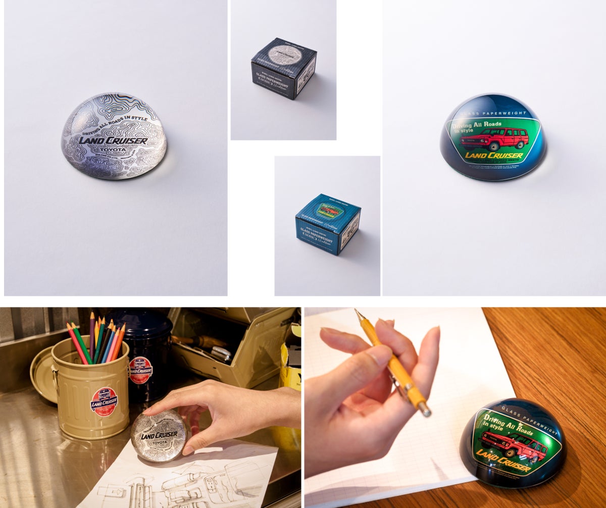 ガラスドームのずっしりとした手触り感や底面のフェルトがなんとも心地よいペーパーウェイト。本来の用途はペーパーウェイトではあるものの、ガラスドームに浮かび上がるレトロ&モダンなランドクルーザーデザインは、卓上を彩るオブジェとして眺めるだけでも幸せな気分にしてくれます。