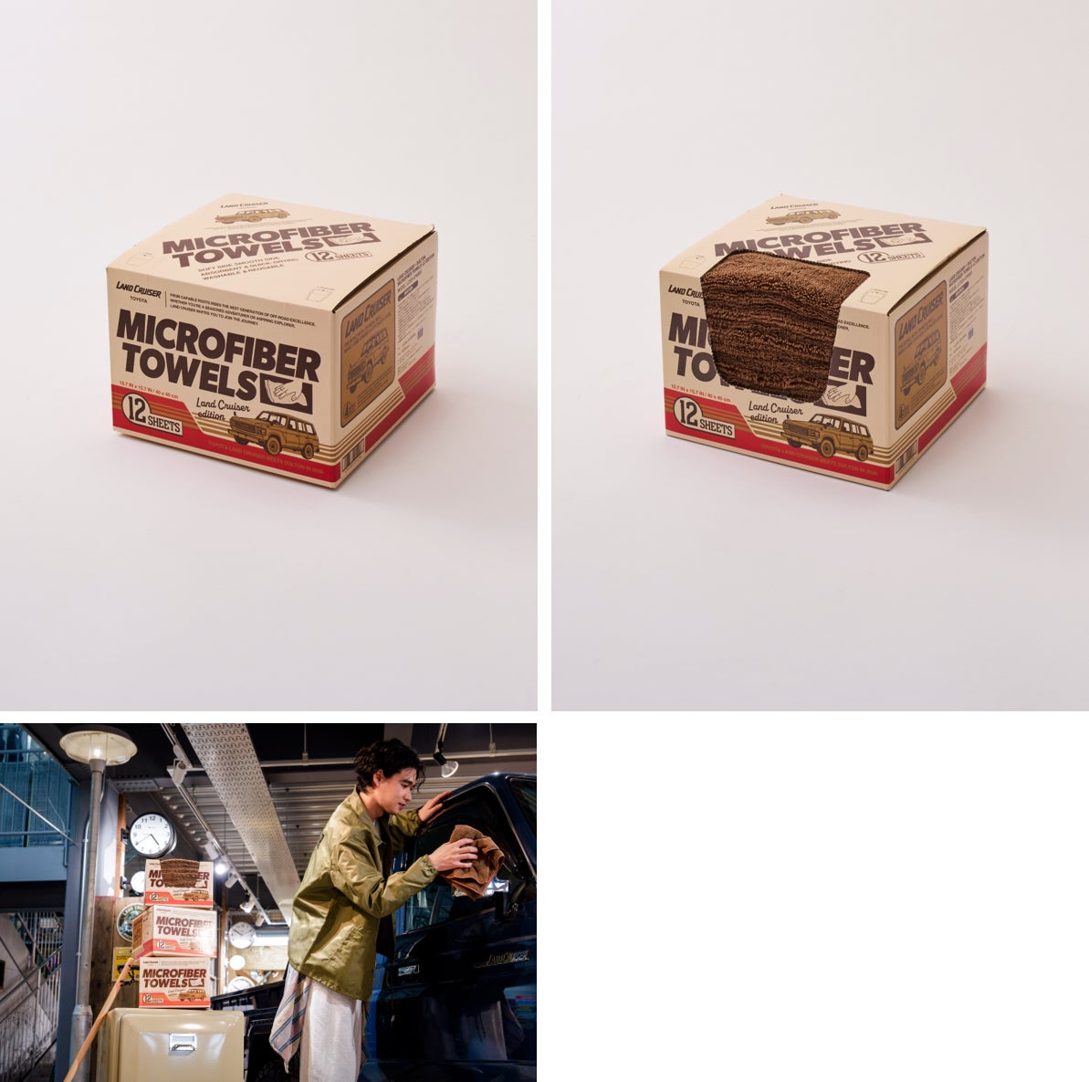 随所にランドクルーザーのモチーフを散りばめた遊び心あるレトロな雰囲気のボックスデザイン。中には、家の掃除はもちろん、車内のメンテナンスや洗車後の拭き上げにも重宝する厚手の大判マイクロファイバータオルが12枚入っています。