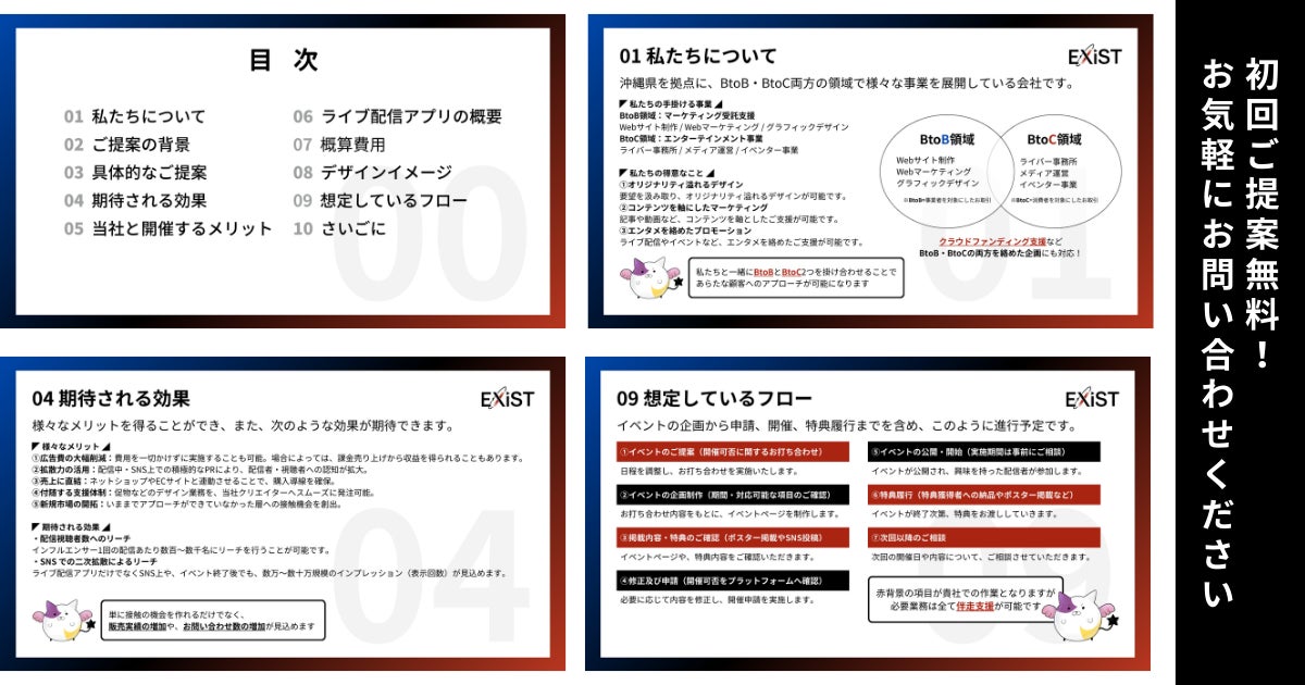 ただの「ホームページ・SNS掲載」はどこにでもある提案ですが、「ライブ配信」などエンタメ要素を取り入れた提案はほぼゼロです。