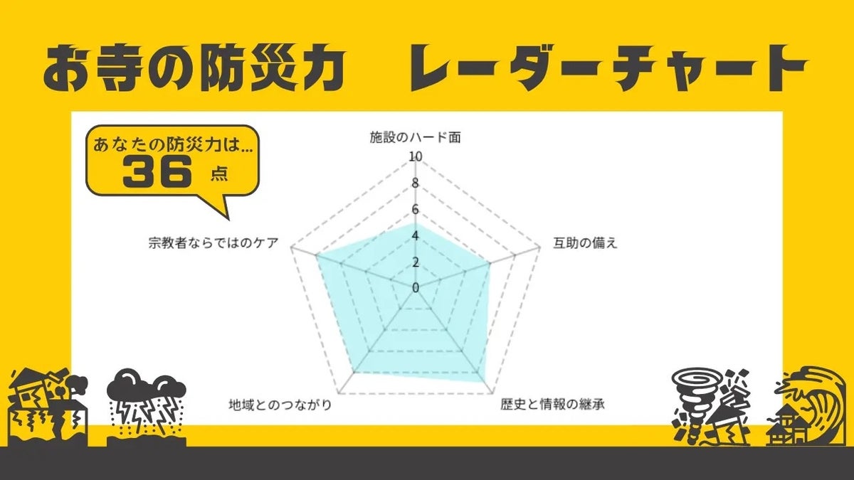 「どこから手をつければいいか分からない」という悩みに対し、全25項目のチェックシートで防災力をレーダーチャート化。自坊の強みと課題を客観的に可視化します。最後には宗派の垣根を超えて知恵を出し合い、「明日、お寺に戻ってすぐにできる一歩」を具体的に持ち帰っていただきます。
