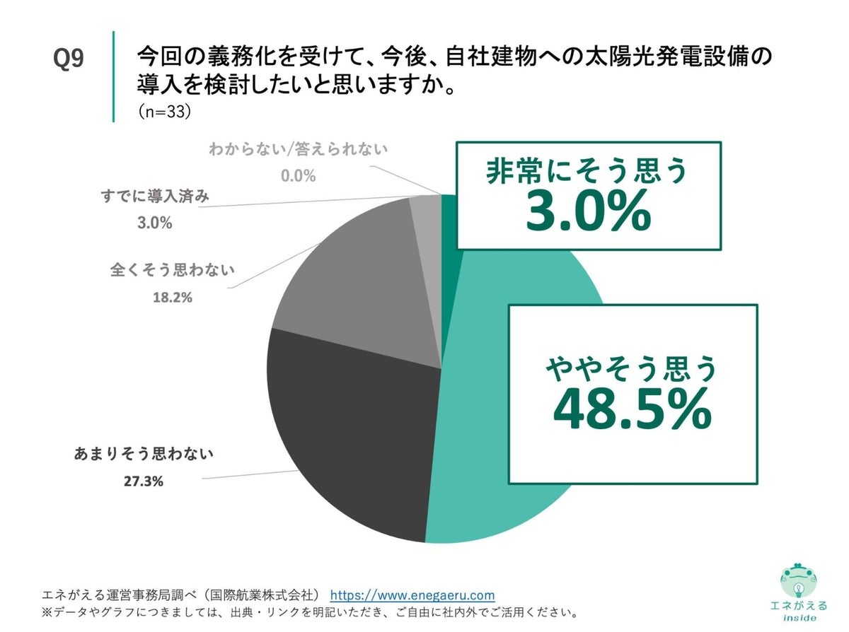 「Q9. Q1で「内容を詳しく知っている」「概要は知っている」かつQ2で「該当しない」と回答した方にお聞きします。今回の義務化を受けて、今後、自社建物への太陽光発電設備の導入を検討したいと思いますか。」(n=33)と質問したところ、「非常にそう思う」が3.0%、「ややそう思う」が48.5%という回答になりました。