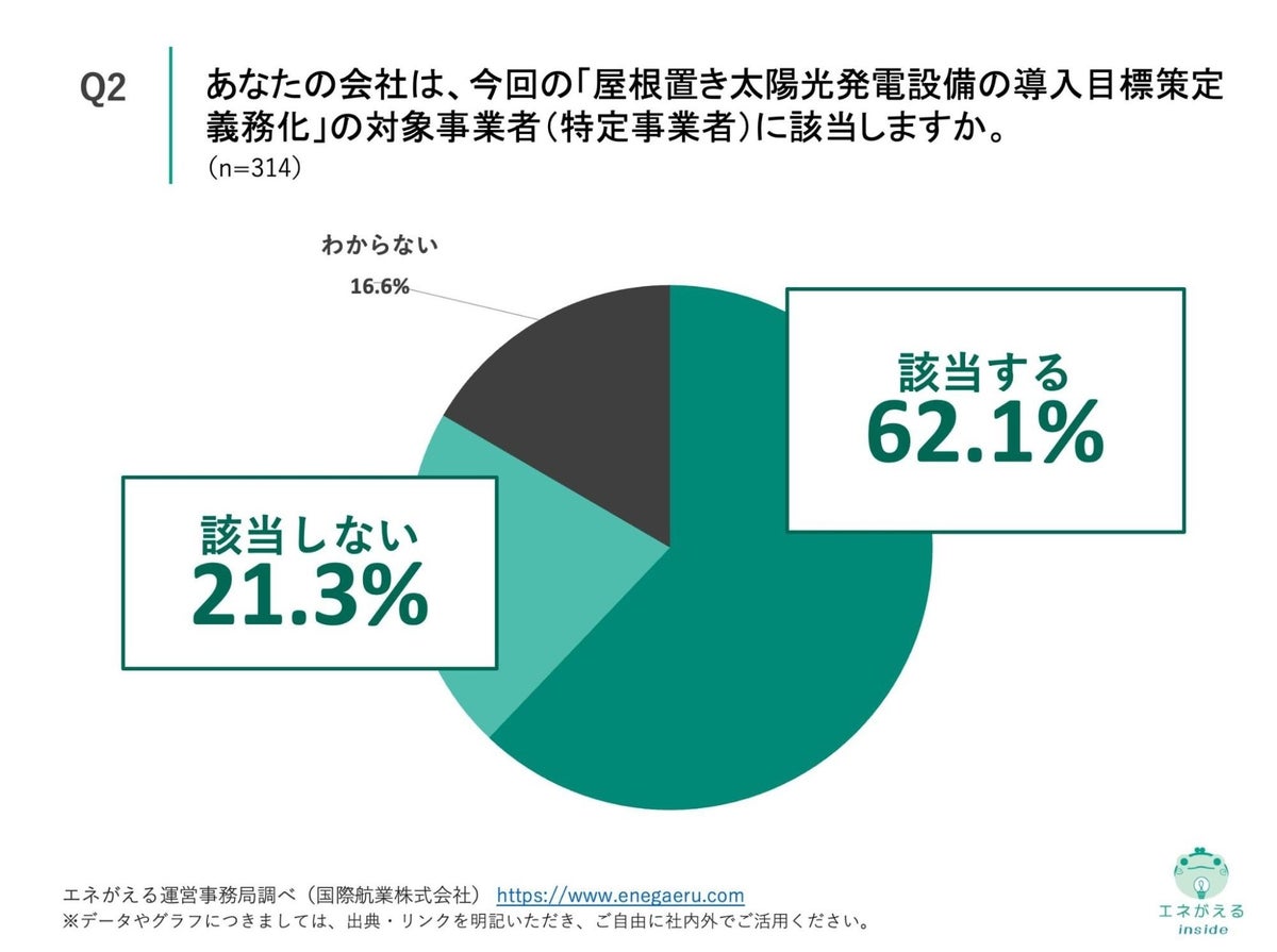 「Q2. あなたの会社は、今回の「屋根置き太陽光発電設備の導入目標策定義務化」の対象事業者(特定事業者)に該当しますか。」(n=314)と質問したところ、「該当する」が62.1%、「該当しない」が21.3%という回答になりました。