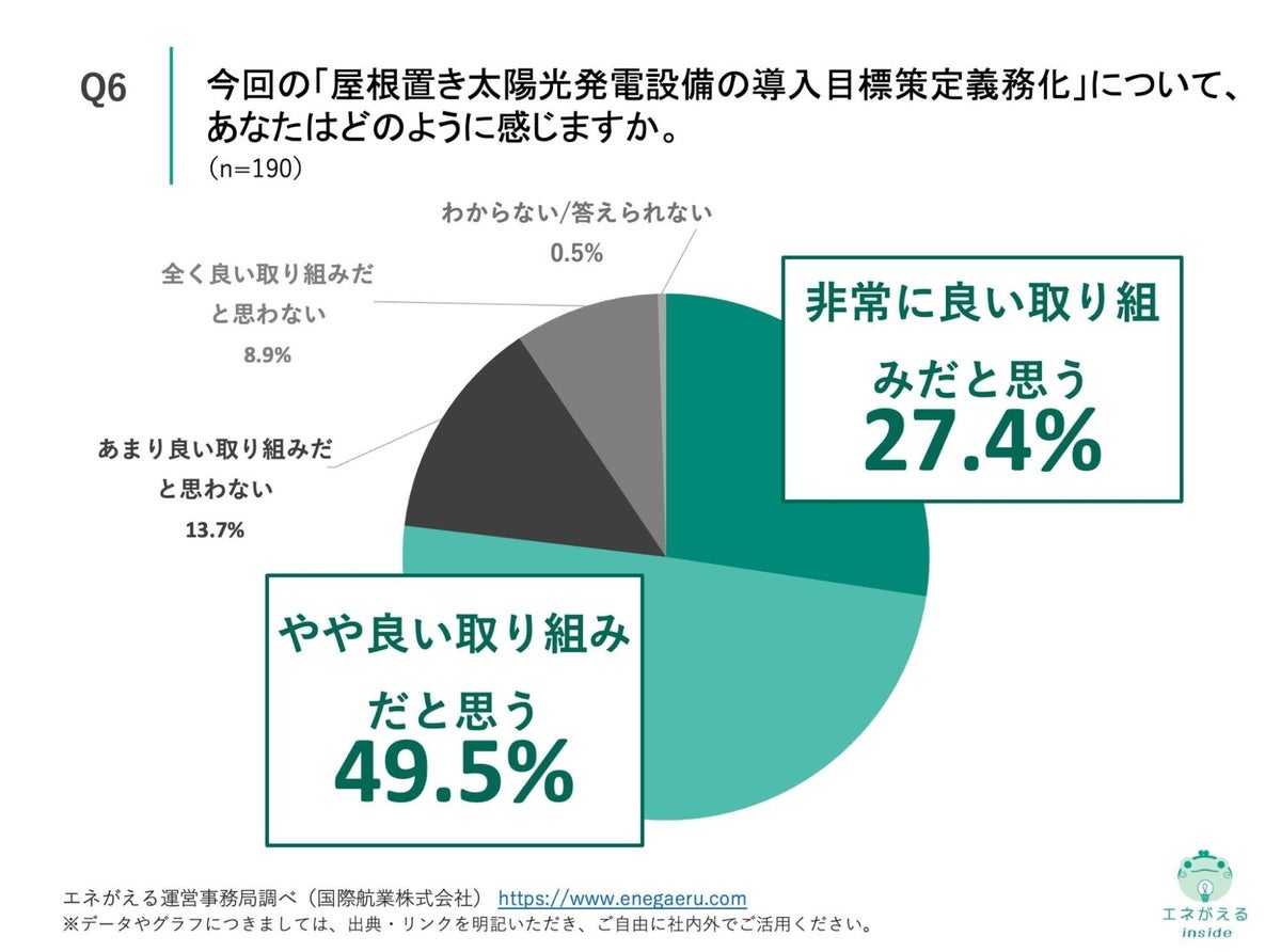「Q6. Q1で「内容を詳しく知っている」「概要は知っている」と回答した方にお聞きします。今回の「屋根置き太陽光発電設備の導入目標策定義務化」について、あなたはどのように感じますか。」(n=190)と質問したところ、「非常に良い取り組みだと思う」が27.4%、「やや良い取り組みだと思う」が49.5%という回答になりました。