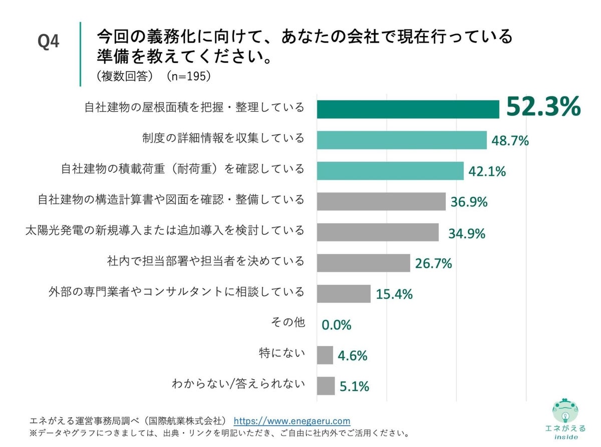 「Q4. Q2で「該当する」と回答した方にお聞きします。今回の義務化に向けて、あなたの会社で現在行っている準備を教えてください。(複数回答)」(n=195)と質問したところ、「自社建物の屋根面積を把握・整理している」が52.3%、「制度の詳細情報を収集している」が48.7%、「自社建物の積載荷重(耐荷重)を確認している」が42.1%という回答になりました。