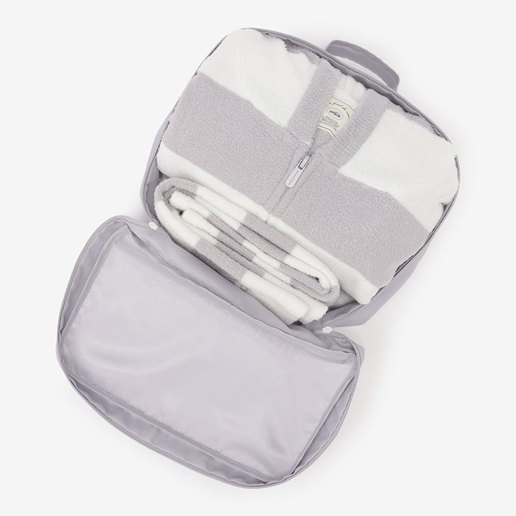 スムーズィー生地のボーダー柄パーカと着圧ソックスは、なめらかな肌触りが特徴で、機内や旅行先での寒さや足の疲れ対策にもぴったりです。JALオリジナルならではのポイントとして、パーカの内側にはJALロゴのタグが付いています。また、パーカとソックスをまとめてコンパクトに収納できるポーチは、持ち手つきでパッキングケースとしてもお使いいただけます。