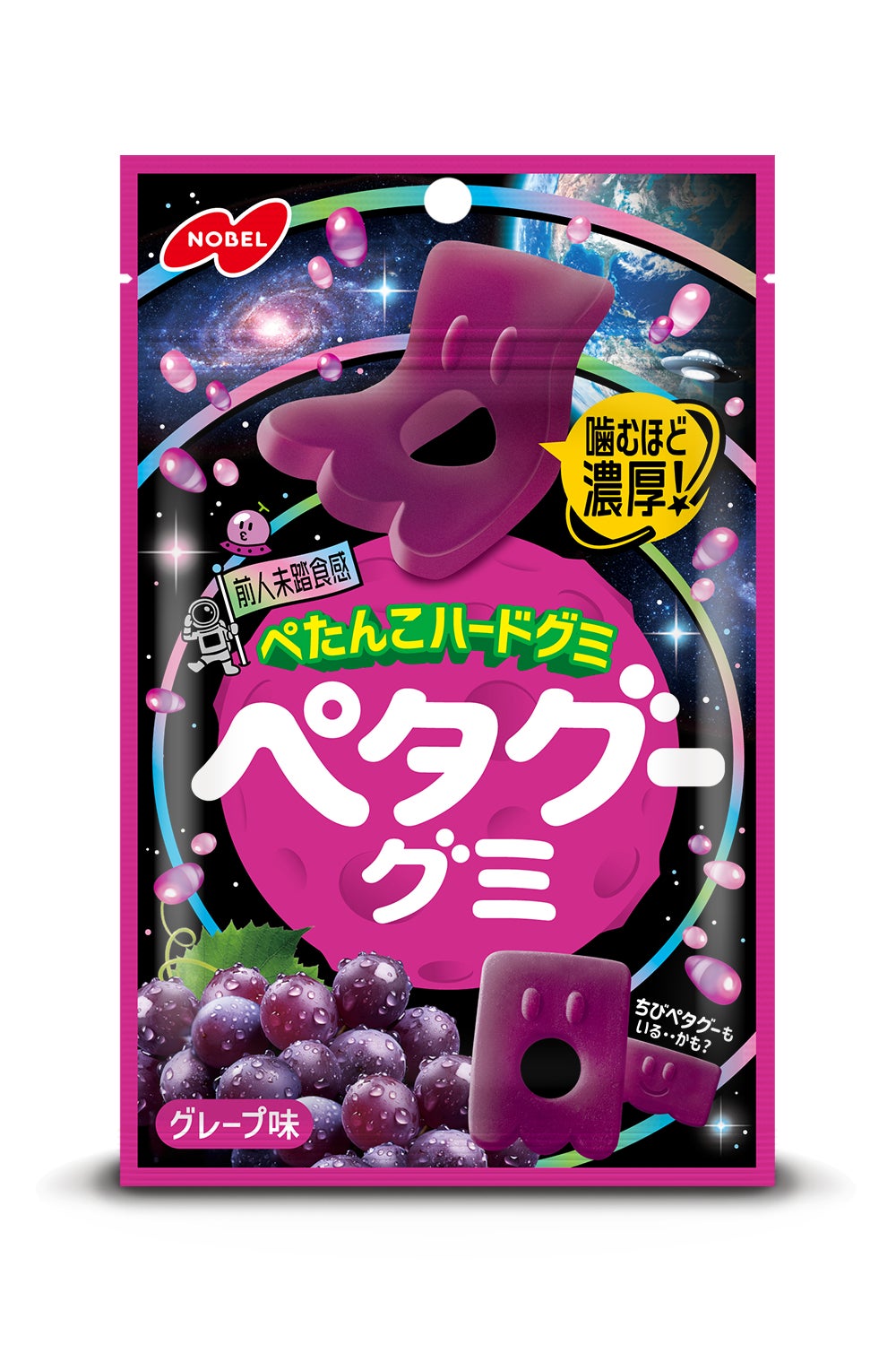 パッケージデザインは、「ペタグーグミ」の世界観である「宇宙」のテイストをより濃く反映した「ペタグーグミ」ならではのユーモアを感じていただけるデザインに刷新し、味わいについては、「ひと噛み目から感じられる濃厚さ」を追求し、グレープ味の噛むほどに芳醇な香りと甘みが広がり、つい手が伸びてしまうようなおいしさに仕上げています。