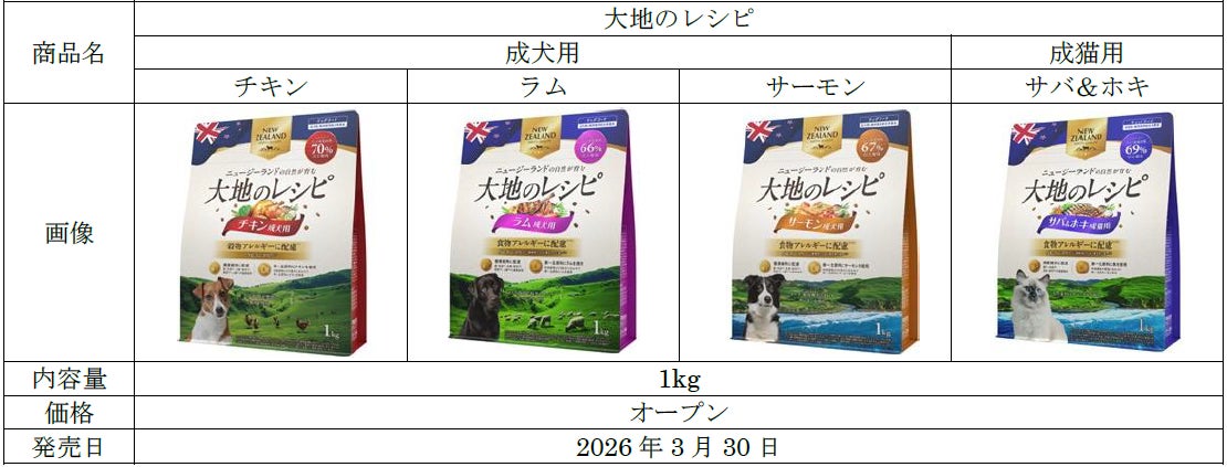 アイリスオーヤマ株式会社(本社:宮城県仙台市、代表取締役社長:大山 晃弘)は、高品質の原材料を使用し食物アレルギーに配慮(※1)したペット用総合栄養食「大地のレシピ」シリーズ4種(成犬用3種、成猫用1種)を、2026年3月30日より全国のペット専門店やインターネットサイトを中心に順次発売(※2)します。