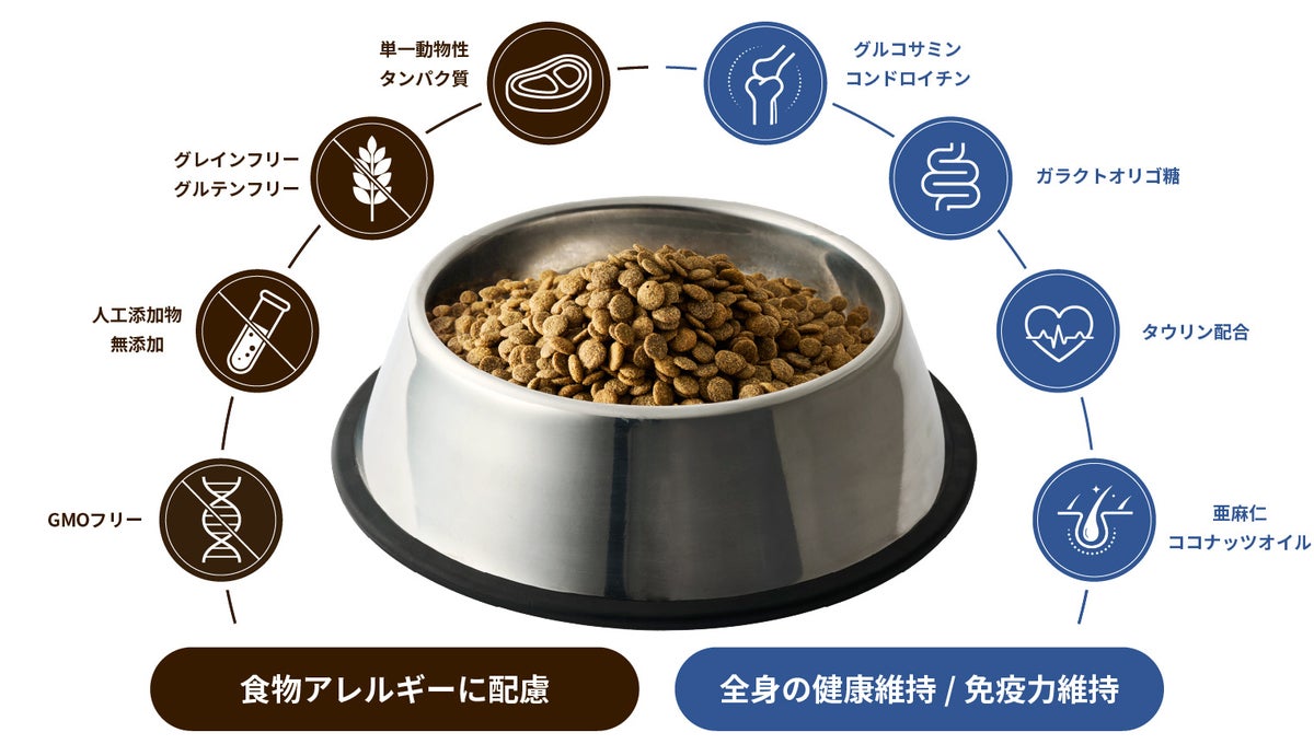 今回発売する「大地のレシピ」シリーズは、獣医師監修のもと高品質な原材料を使用した総合栄養食です。単一動物性タンパク質を使用することで、食物アレルギーのリスク低減に配慮しています。また、グレイン(穀物)、グルテン、人工添加物を使用していないため、ペットの体への負担を軽減します。