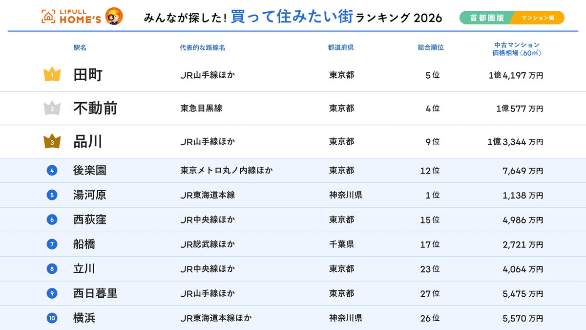 今回初めて発表する、首都圏の「買って住みたい街」について、マンションのみを集計した「2026年 LIFULL HOME'S みんなが探した!買って住みたい街ランキング(首都圏版・マンション購入編)」は、「不動前」と僅差で「田町」が1位に輝きました。