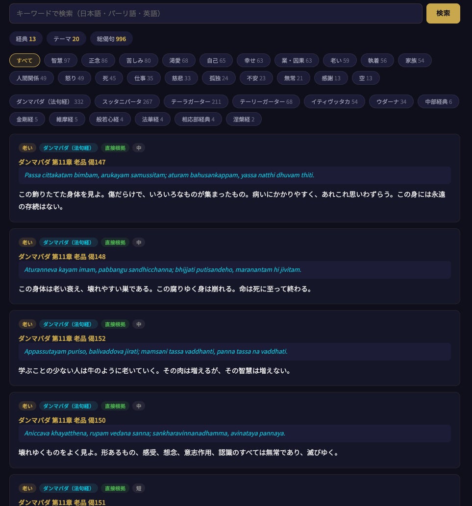 ユーザーの相談内容から「苦しみ」「怒り」「無常」「人間関係」など20のテーマを自動判定し、データベースに収録された約2,000の偈句(法句経・般若心経・維摩経など15経典)から関連する言葉を検索。