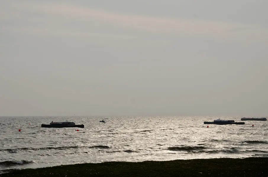 パイロン用の台船がレースを待つ