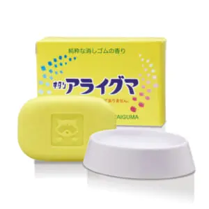 この石けん消しゴム、ちゃんとパッケージの箱に入っているのですが、そのパッケージもどこかで見た事がある感じ。いつも手を洗う時に使っているアノ石けんとか、お風呂で使っているアレみたいなのとか、お洗濯の時の部分洗いにも使っているアレっぽい見た目。ロゴまでいつもよく目にするブランド石けんに限りなく寄せていっています。