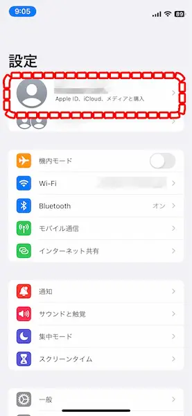 では「ファミリー共有」を設定していきます。今回は「iOS16」をベースとして紹介。まず「設定」アイコンから自身のアカウントを選択してください。