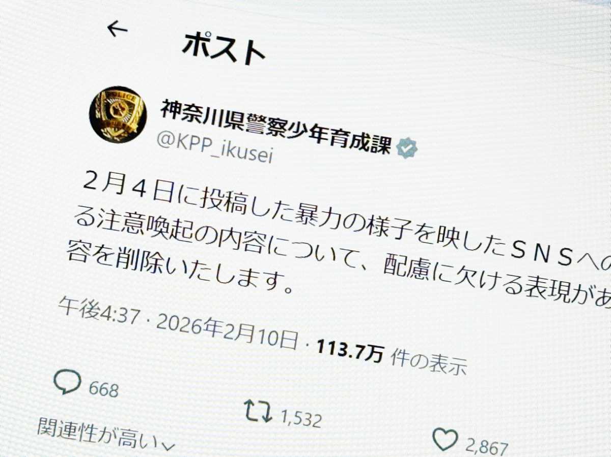神奈川県警、暴力動画の拡散警告ポストを削除 「配慮に欠けた」