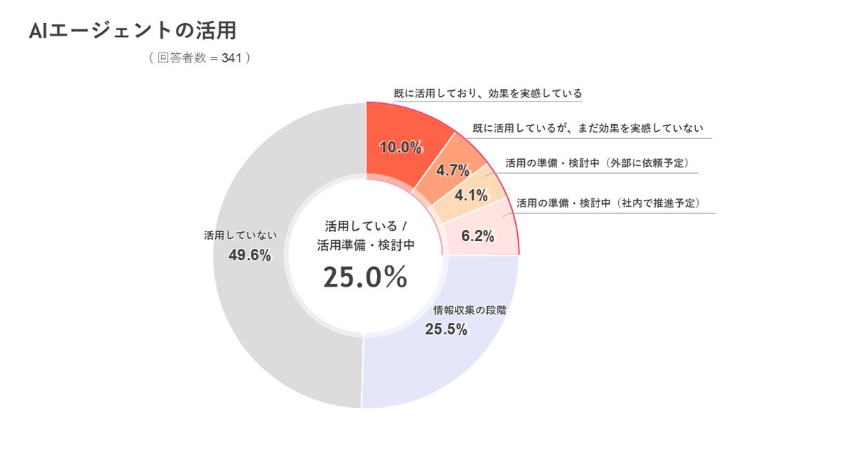 業務でAIエージェントを活用しているか質問したところ、「活用している」が14.7%、「準備・検討中」が10.3%となりました。また、25.5%の企業が情報収集しており関心が高まっていることが分かります。
