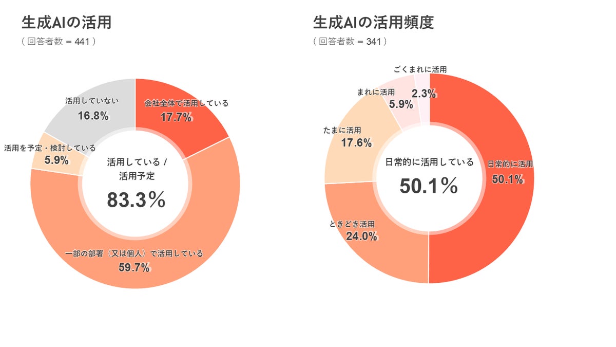 近年話題の生成AI、住宅業界で活用している方は77.4%となり、昨年の28.1%を大きく上回りました。 また、生成AIを「日常的に活用している」と回答した方が50.1%と半数を超えました。