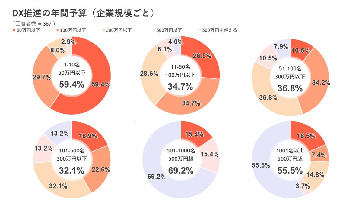 ◆ DX推進のための年間予算は従業員10名以下では「50万円以下」、11-50名以下では「100万円以下」、51-100名以下では「300万円以下」、101-500名以下では「300万円以下」、501名以上では「500万円を超える」が最多