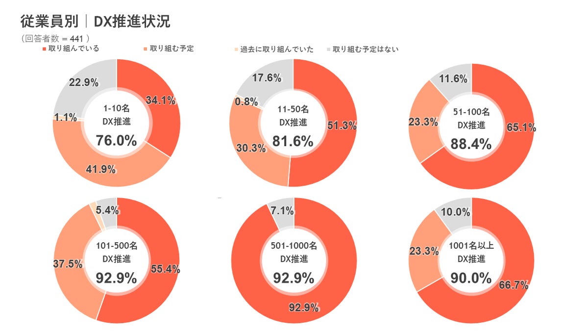 ◆ 従業員数別のDX推進状況は「101-500名」「501-1,000名」「1,001名以上」で90%超、「1-10名未満」も76.0%に