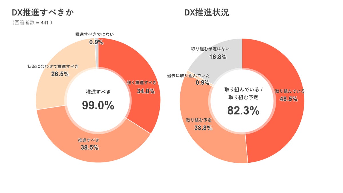 ◆ 「DX推進すべきだと思う」は99.0%、「DXに実際に取り組んでいる(取り組む予定)」は82.3%