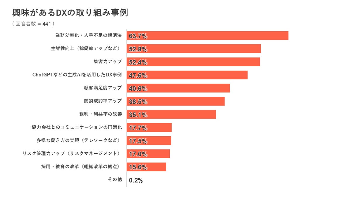 興味があるDXの取り組み事例について質問したところ、「業務効率化・人手不足の解消」が最多で63.7%、次いで「生産性向上(稼働率アップなど)」が52.8%、「集客力アップ」が52.4%となりました。また、「生成AIを活用したDX事例」は昨年の32.3%から15ポイント増加の47.6%となりました。