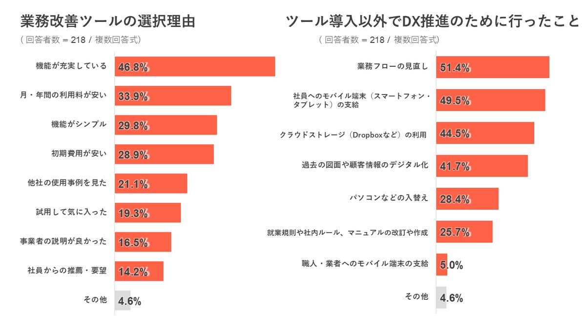 「DXに取り組んでいる(いた)」と回答した方に対して、導入した業務改善ツールの選定理由を質問したところ、「機能が充実している」が最多で46.8%、次いで「月・年間の利用料が安い」が33.9%となりました。 また、ツール導入以外でDX推進のために行ったことについて質問したところ、「業務フローの見直し」「社員へのモバイル端末の支給」が上位の回答となりました。