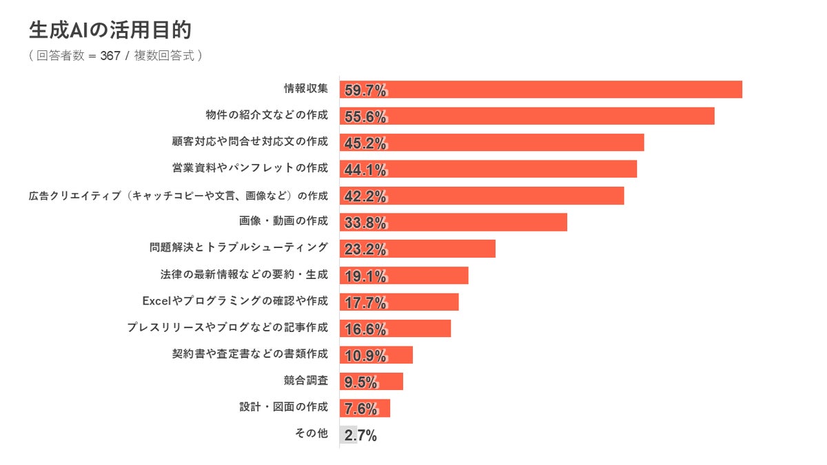 活用の目的は「情報収集」「住宅・物件の紹介文などの作成」「顧客対応や問合せ対応文の作成」などが上位となりました。