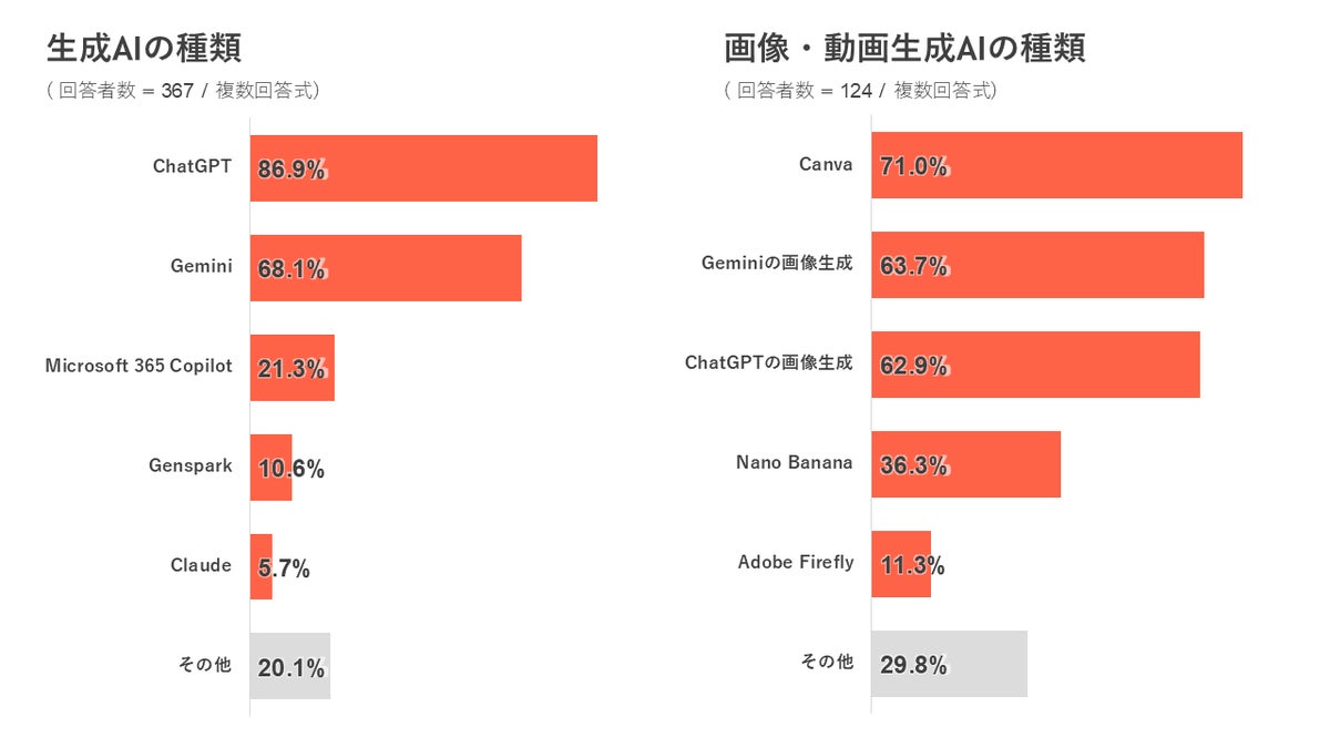 ◆ 利用している生成AIは「ChatGPT」が86.9%で最多、画像・動画生成AIでは「Canva」が71.0%で首位