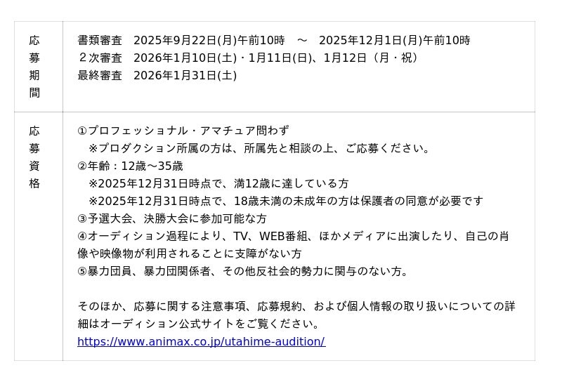 オーディションサイト:https://www.animax.co.jp/utahime-audition/