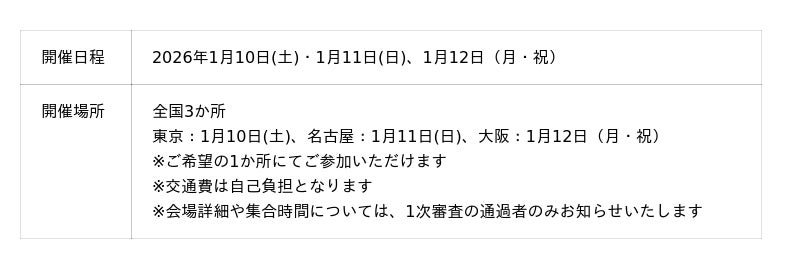 [表3: https://prtimes.jp/data/corp/101562/table/538_3_64408fbf156a03c81539eb4e71e509d2.jpg?v=202509220946 ]審査結果は通過された方のみにご案内いたします。