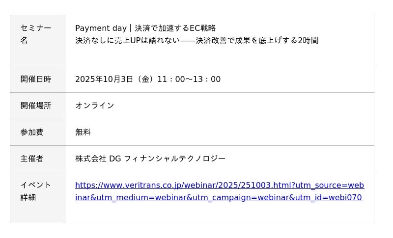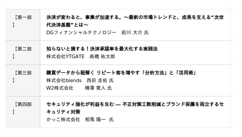 [表1: https://prtimes.jp/data/corp/162852/table/17_1_313eb12b25f5d2d636e6ca5bfa24ad9c.jpg?v=202509221116 ]本イベントは、以下の課題を抱える事業者を対象に、決済市場のトレンドや決済データ活用、不正アクセス対策の最新動向を共有します。