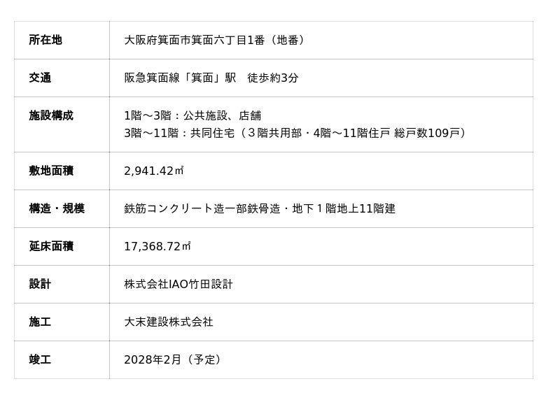 本物件は、阪急箕面線「箕面」駅前のロータリーに隣接した地上11階建て・総戸数109戸の共同住宅・公共施設・店舗等が一体となった定期借地権付きの複合マンションです。4階~11階は全戸トランクルーム付きの3LDKを中心とした住宅フロアとするほか、1階~3階部分の大部分は旧建物の区分所有者である箕面市が再取得し、箕面の玄関口としてふさわしい、にぎわい創出の核施設として、地域交流や観光交流、子育て施設など駅周辺の活性化に貢献する施設が整備される予定です。