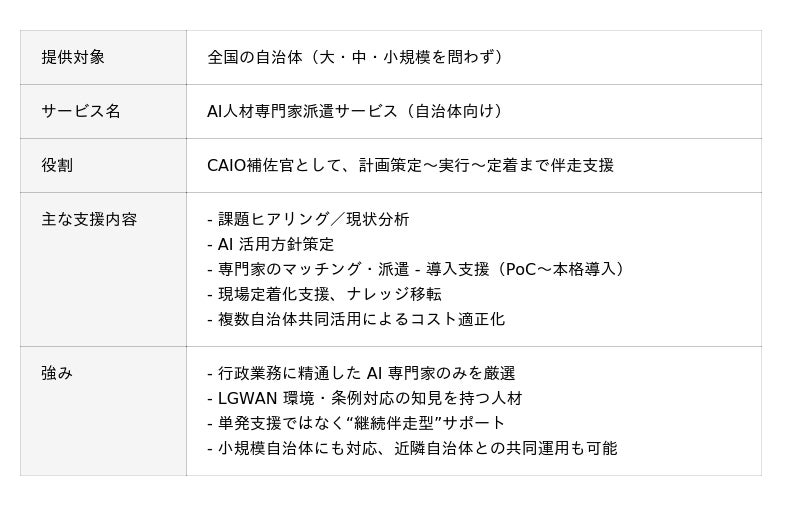 本サービスでは、自治体に対してCAIO(最高AI責任者)補佐官の立場で専門家を派遣し、AI活用の計画策定から導入支援、そして運用・定着化のフォローまでを包括的に伴走支援いたします。