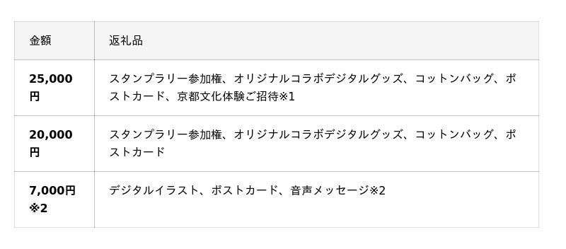 本企画は、京都府のふるさと納税の返礼品としてマルチエンターテイナー「P丸様。」とコラボしたデジタルコンテンツを提供するものです。寄付プランに応じて、人気クリエイター「P丸様。」のオリジナルデジタルイラストや音声メッセージ、京都府内を巡るスタンプラリー形式のコンテンツなどが提供されます。