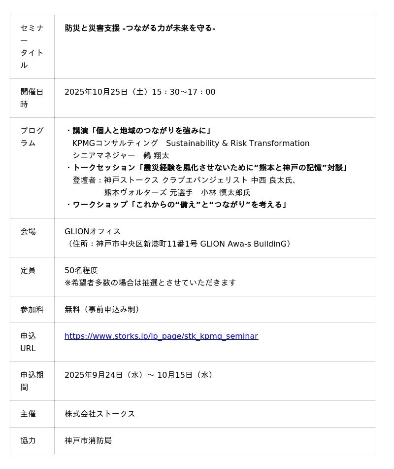この度KPMGコンサルティングは、神戸ストークスとともに「TOTTEI ALL GREEN ACTION」の一環として、神戸ストークスが注力する「防災と災害支援」「ダイバーシティ」「医療」「環境」「子どもの未来」の5つのテーマに沿った講演やワークショップを組み合わせたセミナーを開催します。なお、同セミナーは、2025年10月から神戸ストークスのホームゲーム開催日に合わせ5回実施し、神戸ストークス関係者や各テーマに専門的知見を持つKPMGコンサルティングのプロフェッショナルなどが講師として登壇するほか、地域社会が抱える課題を自分事として捉え、行動へ移すことを目指したプログラムを実施する予定です。
