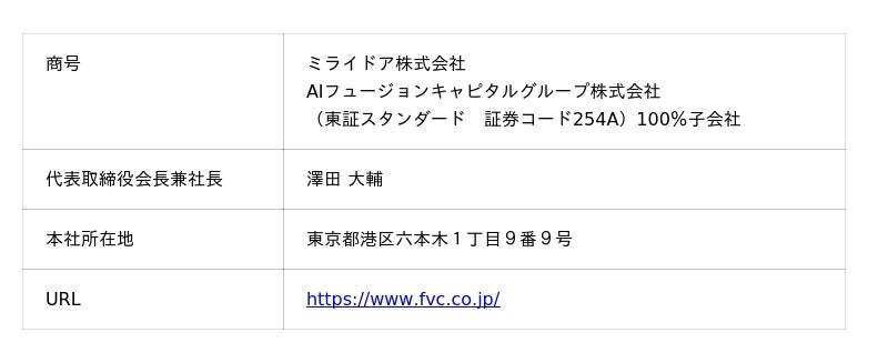 ミライドア株式会社(本社:東京都港区、代表取締役会長兼社長:澤田 大輔、以下「ミライドア」)は、長野県・株式会社日本政策金融公庫(以下「日本政策金融公庫」)と連携し、県内金融機関等と共同で設立した「信州スタートアップ・承継支援2号投資事業有限責任組合」より、建設業の現場で信頼性の高い3次元データ化に取り組む株式会社FLIGHTS(上田拠点(営業・開発):長野県上田市、本社:東京都渋谷区、代表取締役:峠下 周平、以下「FLIGHTS」)に投資を実行しましたことをお知らせいたします。