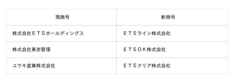 株式会社ETSグループ(東京都豊島区、代表取締役社長:上江州剛、証券コード:253A以下「当社グループ」)の連結子会社である株式会社ETSホールディングス、株式会社東京管理、ユウキ産業株式会社は、下記の通り、2025年10月1日付で商号変更となりましたのでお知らせいたします。