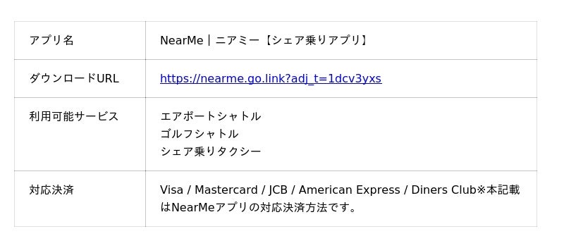 「NearMe」は、独自のAIを活用した最適なルーティングで、出発地から目的地までの移動をドアツードアで結ぶタクシーのシェアサービスです。その中でも、空港とその周辺の都市部を結ぶ空港送迎型の『エアポートシャトル』は、2019年8月のサービス開始から、 多くの方にご利用いただき、累計予約人数100万人※1を達成しました。現在は、全国16の空港※2(羽田空港、成田空港、伊丹空港、関西空港、新千歳空港、中部国際空港、福岡空港、那覇空港、旭川空港、帯広空港、青森空港、仙台空港、静岡空港、南紀白浜空港、徳島空港、北九州空港)と、空港周辺の都市部でご利用いただくことができます。対象エリアであれば、出発地となるご自宅から空港、そして空港から最終目的地まで一気通貫でつながるため、公共交通機関の乗り換えがなくなるなど、ストレスフリーな移動体験を提供することができます。また、貸切送迎サービスや、東京都と千葉県全域のゴルフ場と東京都23区内を結ぶゴルフシャトルなど、シチュエーションに応じて様々な移動のニーズに対応するための各種サービスを展開しています。