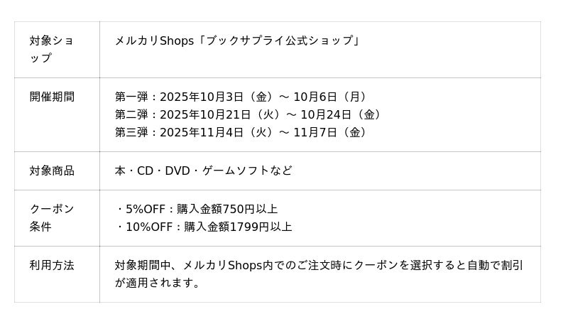 株式会社ブックサプライ(本社:大阪府吹田市、代表取締役:藪田真吾)は、メルカリShops「ブックサプライ公式ショップ」にて、2025年10月から11月にかけて全3回の期間限定クーポンキャンペーンを実施いたします。