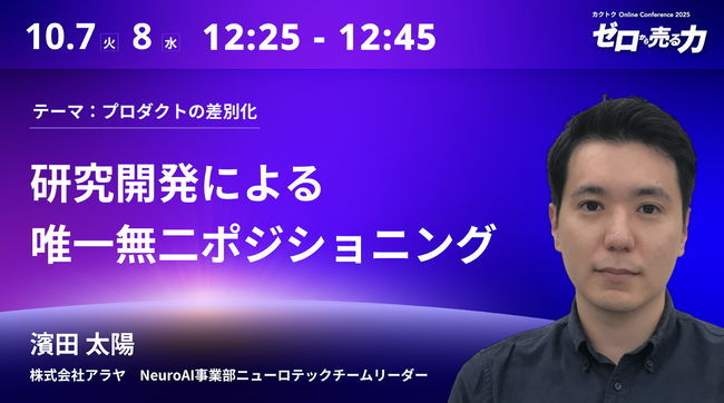 株式会社アラヤ(所在地:東京都千代田区、代表取締役:金井良太、以下「アラヤ」)は、2025年10月7,8日に開催されるオンラインカンファレンス「カクトク Online Conference 2025」(テーマ:ゼロから売る力 ~新規事業を伸ばす営業戦略×AI活用×プロダクトの差別化~)にニューロテックチームリーダー 濱田太陽が登壇します。