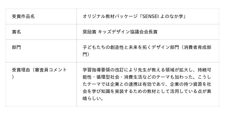 株式会社ARROWS(本社:東京都港区、代表取締役社長:浅谷治希)が提供するオリジナル教材パッケージ「SENSEI よのなか学」が、第19回キッズデザイン賞において、「子どもたちの創造性と未来を拓くデザイン部門」の奨励賞を受賞したことをお知らせいたします。
