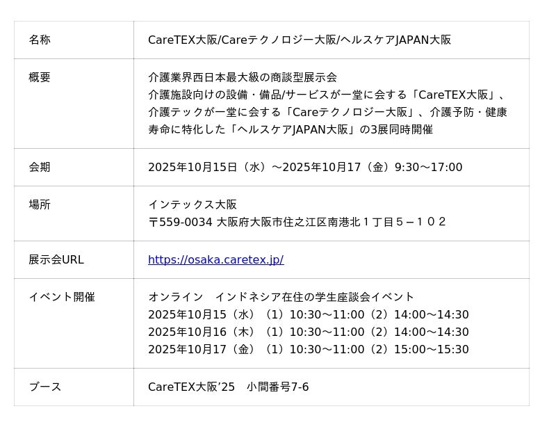 G.A.コンサルタンツ株式会社(本社:東京都渋谷区 代表取締役:勝本 健司)は、2025年10月15日(水)~17日(金)にインテックス大阪で開催される、西日本最大級の展示会「CareTEX大阪’25」に出展します。ブース内で事例紹介やサービス紹介展示を構え、会期中インドネシアの教育機関とオンラインで繋ぎ、日本の就業を目指す学生たちと交流するイベントを開催します。ぜひ、この機会に当社ブースへお立ち寄りください。