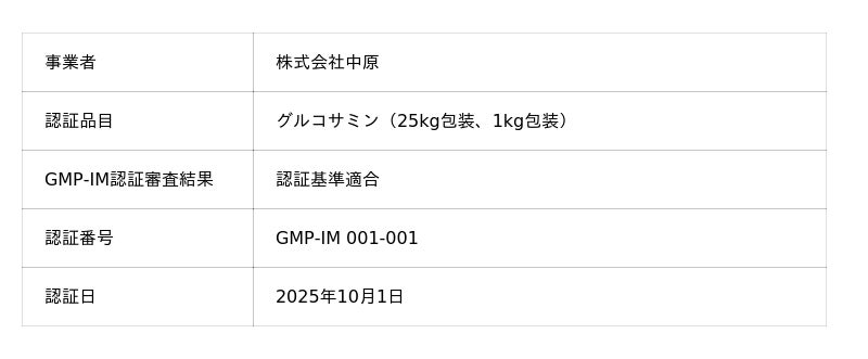 (株)中原、日本で初めて「輸入原材料GMP認証(GMP-IM認証)」をグルコサミンで取得!
